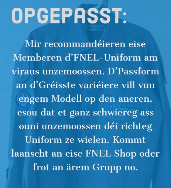 Mir recommandéieren eise Memberen d’FNEL-Uniform am viraus unzemoossen. D’Passform an d’Gréisste variéiere vill vun engem Modell op den aneren, esou dat et ganz schwiereg ass ouni unzemoossen déi richteg Uniform ze wielen. Kommt laanscht an eise FNEL Shop oder frot an ärem Grupp no.